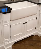 Photo shows a beautiful farmhouse sink cabinet with custom leg and elegant arch toe kick detail.